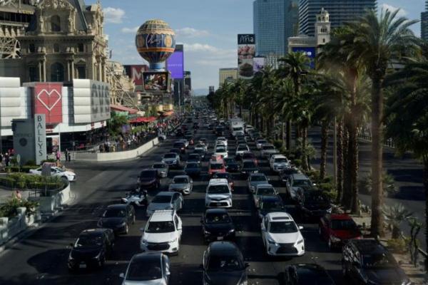 Lalu lintas terlihat di sepanjang Strip pada Memorial Day di Las Vegas, Nevada, AS, 31 Mei 2021. Foto: Reuters