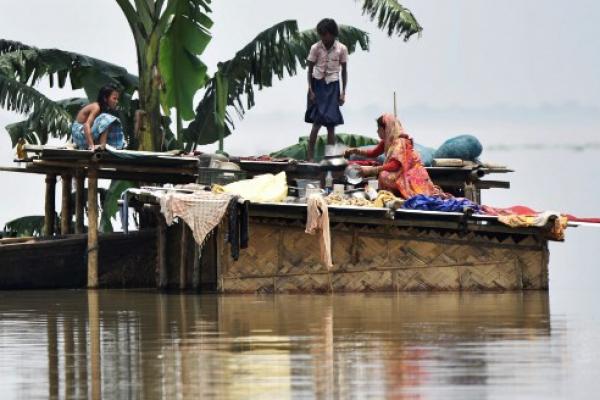 Foto ini diambil pada 16 Juli 2019, anggota keluarga India berdiri di atas sebuah gubuk di daerah yang terkena banjir di Hatishila di distrik Kamrup di Assam India (foto: AFP/ thejakartapost.com)