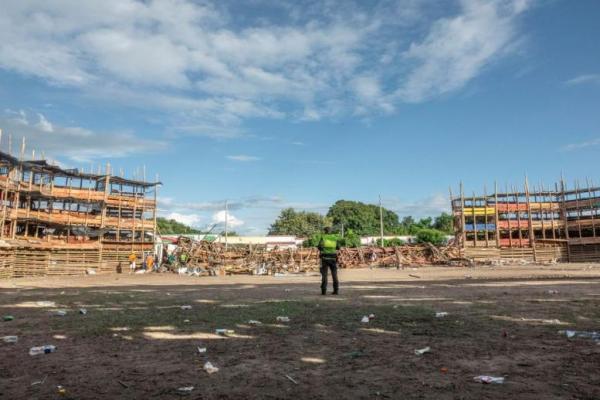 Seorang polisi berdiri di depan reruntuhan arena adu banteng di Kolombia yang menewaskan 4 orang. Foto: Reuters