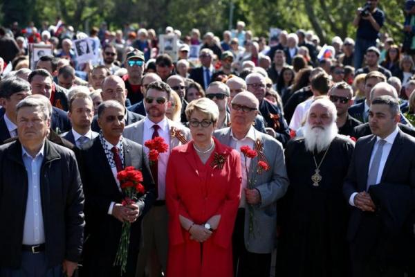 Duta Besar Rusia untuk Bulgaria Eleonora Mitrofanova menghadiri perayaan Hari Kemenangan, di Sofia, Bulgaria, 9 Mei 2022. Foto: Reuters