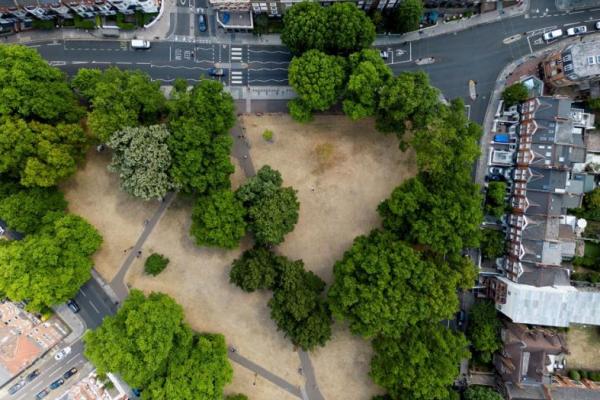 Rerumputan di Parsons Green terlihat kering dan berwarna cokelat akibat cuaca panas belakangan ini di London, Inggris, 14 Juli 2022. Foto: Reuters