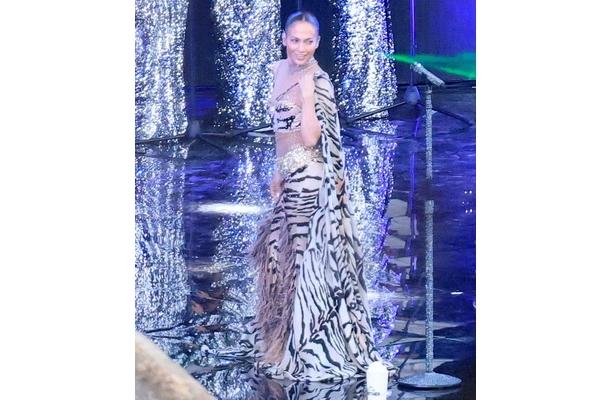 Dikutip dari La Repubblica, Jennifer Lopez mengenakan gaun dua potong motif animal print dengan kilauan dan bulu saat melakukan geladi bersih untuk pertunjukan tersebut.