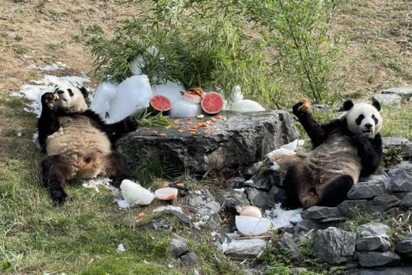 Kembar panda raksasa Bao Di dan Bao Mei menikmati pesta ulang tahun ketiga mereka di kebun binatang PairiDaiza di Belgia pada hari Sabtu.(foto: Chen Weihua/China Daily)