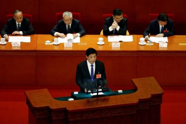 Ketua Komite Tetap Kongres Rakyat Nasional Li Zhanshu berbicara di Aula Besar Rakyat di Beijing, Cina, 8 Maret 2022. Foto: Reuters