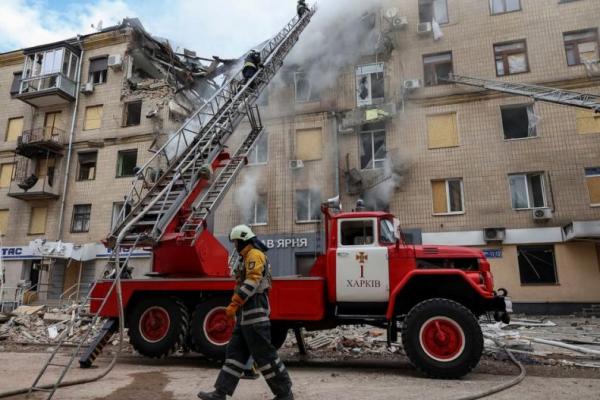 Petugas pemadam kebakaran bekerja di lokasi sebuah bangunan tempat tinggal yang terkena serangan militer Rusia, di Kharkiv, Ukraina 6 September 2022. Foto: Reuters