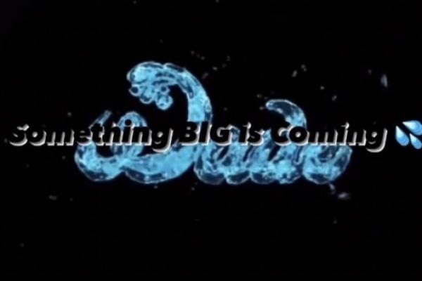 Gambar itu bertuliskan "Sesuatu yang BESAR Akan Datang" dengan Wade dieja menggunakan seni font yang terinspirasi oleh air.