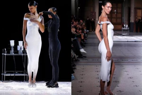 Tubuh Bella Hadid yang Polos Mendadak Kenakan Gaun Putih Setelah Disemprot Cat di Paris Fashion Week. (FOTO: GETTY IMAGES)