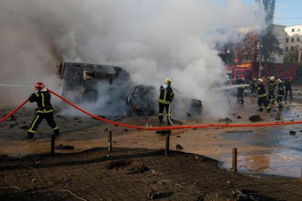 Petugas pemadam kebakaran bekerja memadamkan api di lokasi serangan rudal Rusia, di Kyiv, Ukraina 10 Oktober 2022. Foto: Reuters