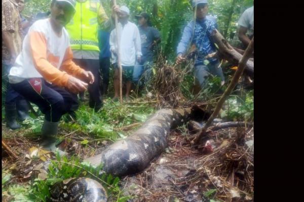 "Kita sudah melakukan pencarian dari Minggu malam dan setelah kita lanjutkan pencarian pada hari ini, masyarakat melihat dan menemukan ular piton yang besar yang ada di semak perkebunan warga," kata Anton.