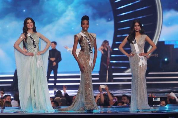 Tiga kandidat terakhir Miss Universe berpose selama kontes Miss Universe di resor Laut Merah Eilat, Israel 13 Desember 2021. Foto:: Reuters