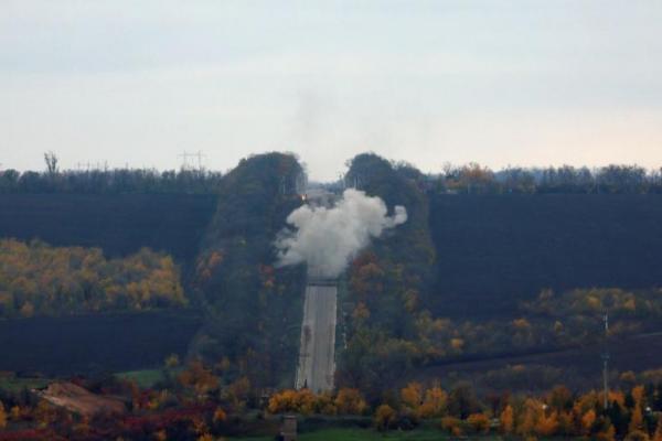 Sebuah ledakan dari roket di jalan utama Bakhmut, Ukraina, 28 Oktober 2022. Foto: Reuters