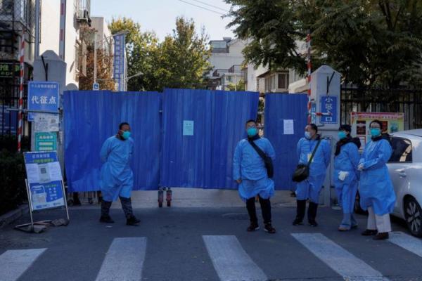 Pejabat yang mengenakan pelindung di luar kompleks perumahan yang dikunci karena Covid di Beijing, 7 November 2022. Foto: Reuters