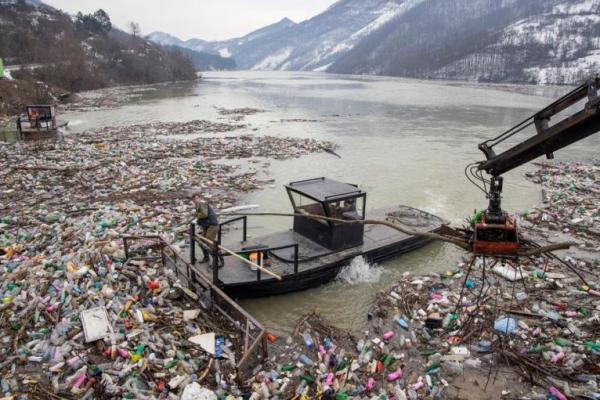 Seorang pekerja mengumpulkan sampah plastik yang mengotori Danau Potpecko yang tercemar dekat kota Priboj, Serbia, 29 Januari 2021. Foto: Reuters