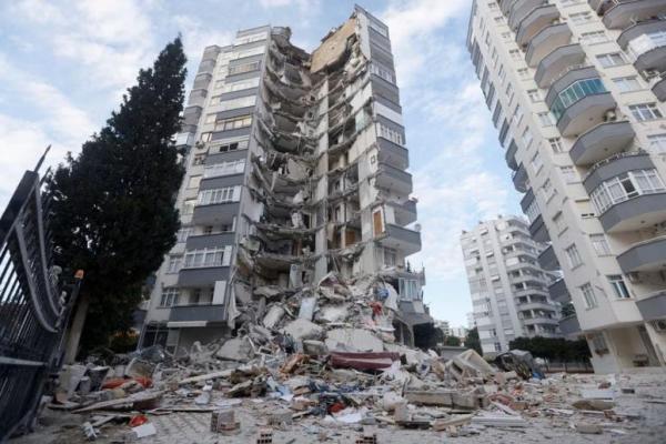 Separuh bangunan runtuh akibat gempa di Adana, Turki, 7 Februari 2023. Foto: Reuters