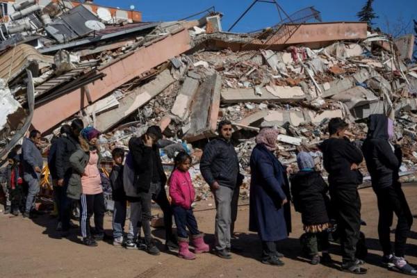 Orang-orang mengantri untuk mendapatkan makanan gratis yang disajikan di tengah puing-puing setelah gempa mematikan di Kahramanmaras, Turki, 16 Februari 2023. Foto: Reuters