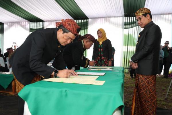 Dengan mengenakan baju adat khas Jawa, Mendes PDTT Abdul Halim Iskandar membacakan Naskah Pelantikan dengan penuh hikmat.