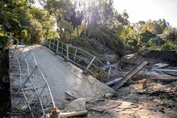 Jembatan rusak setelah sungai kecil meluap menyebabkan rumah-rumah banjir di Havelock North, Selandia Baru. 18 Februari 2023. Foto: Reuters
