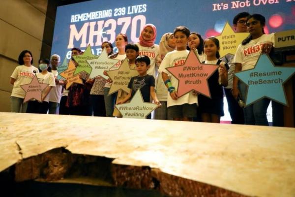 Anggota keluarga korban berfoto bersama dengan puing-puing pesawat Malaysia Airlines MH370 yang hilang di Putrajaya, Malaysia, 7 Maret 2020. Foto: Reuters