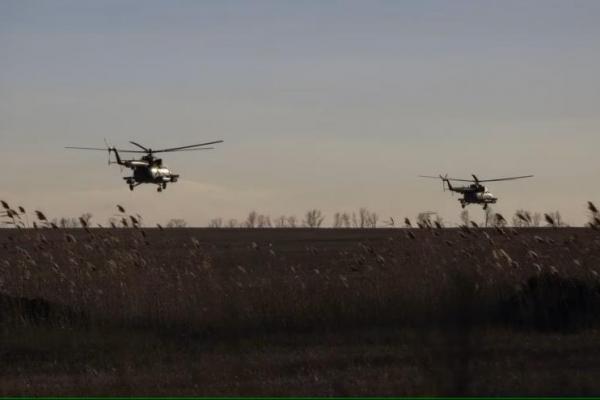 Helikopter Angkatan Bersenjata Ukraina terbang di atas Bakhmut, di wilayah Donetsk, Ukraina 5 Maret 2023. Foto: Reuters