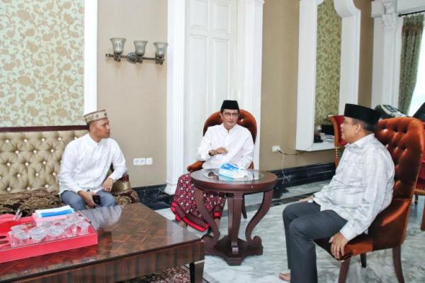 Gorontalo - Wakil Ketua MPR RI Prof. Dr. Ir. H. Fadel Muhammad didampingi istri Ibu Hana Hasanah Fadel Muhammad menerima kunjungan Kapolda Gorontalo yang baru Inspektur Jenderal Polisi Angesta Romano Yoyol, di rumah kediamannya, di Kecamatan Kota Tengah, Gorontalo, Jumat (7/4).