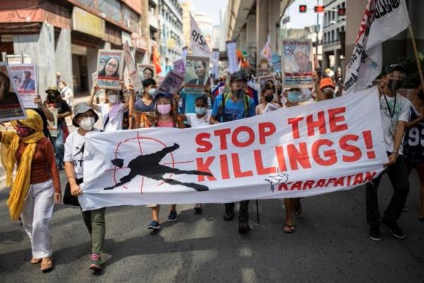Pengunjuk rasa menyerukan untuk menghentikan pembunuhan di luar hukum saat protes tahun terakhir Presiden Rodrigo Duterte menjabat, di Manila, Filipina, 30 Juni 2021. Foto: Reuters