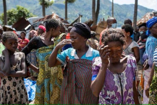 Wanita Kongo bereaksi setelah kematian anggota keluarga mereka saat bajir lumpur di Desa Nyamukubi, Provinsi Kivu Selatan Republik Demokratik Kongo 6 Mei 2023. Foto: Reuters