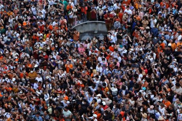 Di belakangnya tampak potret raksasa Raja Maha Vajiralongkorn, kepala lembaga yang dulunya tampaknya tak tersentuh yang untuk pertama kalinya dibawa oleh Move Forward ke dalam wacana publik dalam pemilihan - sebuah sikap yang sekarang dapat mempersulit jalan Pita untuk menjadi perdana menteri.