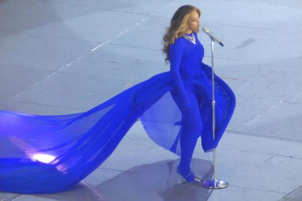 Untuk penampilan spesialnya, Beyonce juga mendebutkan tampilan baru, mengenakan jumpsuit biru elektrik yang menggembung di bagian pinggang dengan buntut panjang gaun yang melambai.