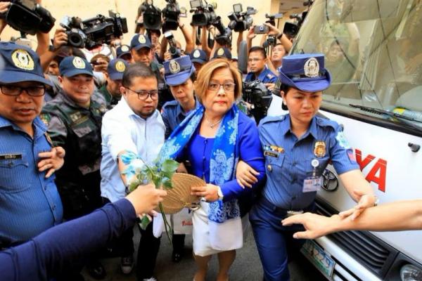 Polisi Filipina mengawal Leila de Lima, seorang senator yang ditahan atas tuduhan narkoba, di kota Quezon, metro Manila, Filipina 13 Maret 2017. Foto: Reuters