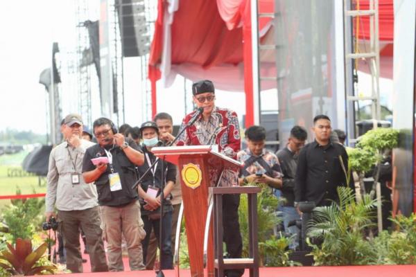 Kepala Badan Penyuluhan dan Sumber Daya Manusia Pertanian (BPPSDMP) Dedi Nursyamsi saat mewakili Menteri Pertanian Syahrul Yasin Limpo memberikan sambutan pada kegiatan Penutupan PENAS Petani Nelayan XVI, di Lanud Sutan Syahrir, Padang, Sumatera Barat, pada Kamis (15/06/2023). (Foto: Humas Kementan)