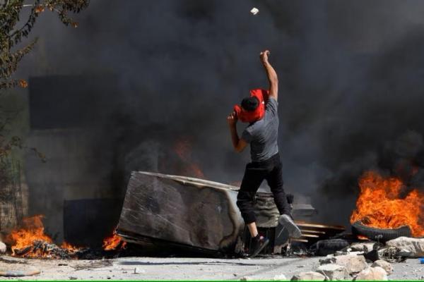 Seorang Palestina melempar batu saat bentrokan dengan pasukan Israel setelah pemukim Israel menyerang desa Umm Safa dekat Ramallah, 24 Juni 2023. Foto: Reuters