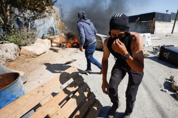 Seorang warga Palestina menutupi wajahnya saat bentrokan dengan pasukan Israel di dekat Ramallah, di Tepi Barat yang diduduki Israel, 24 Juni 2023. Foto: Reuters
