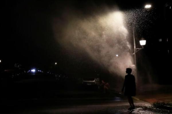 Seorang wanita terlihat dalam siluet di bawah hidran kebakaran yang terbuka saat cuaca panas di Chicago, Illinois, AS, 26 Juli 2020. Foto: Reuters