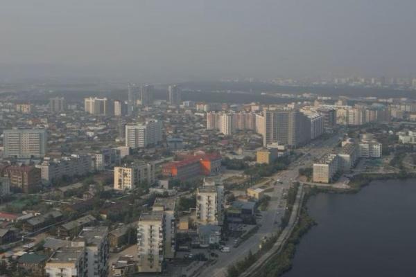 Pemandangan umum menunjukkan gedung-gedung tertutup asap akibat kebakaran hutan, di Yakutsk, Rusia, 9 Agustus 2023. Foto: Reuters