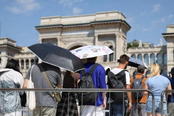 Orang-orang menggunakan payung saat antre memasuki Katedral Duomo saat gelombang panas di Milan, Italia, 21 Agustus 2023. Foto: Reuters