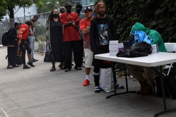 Orang-orang mengantri untuk melakukan tes usap mulut COVID-19 di trotoar di lingkungan Harlem, New York City, AS, 20 Juni 2023. Foto: Reuters