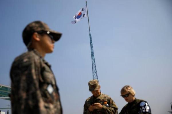 Bendera Korea Selatan berkibar di puncak menara setinggi 100 meter di dalam zona demiliterisasi di Paju, Korea Selatan, 30 September 2019. Foto: Reuters