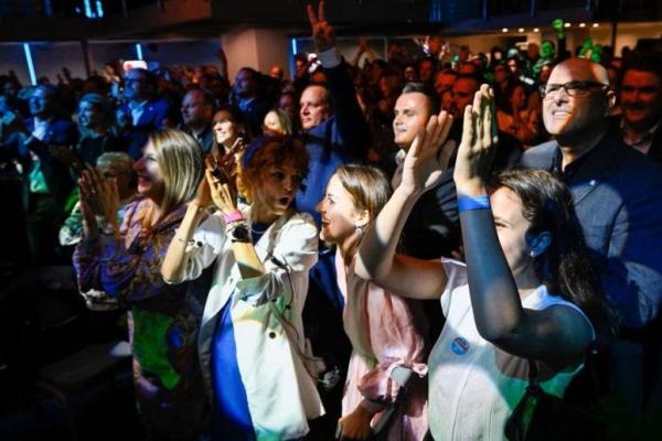 Pendukung partai Progresif Slovakia bereaksi setelah exit poll pertama pemilihan parlemen awal negara itu, di Bratislava, Slovakia, 30 September 2023. Foto: Reuters