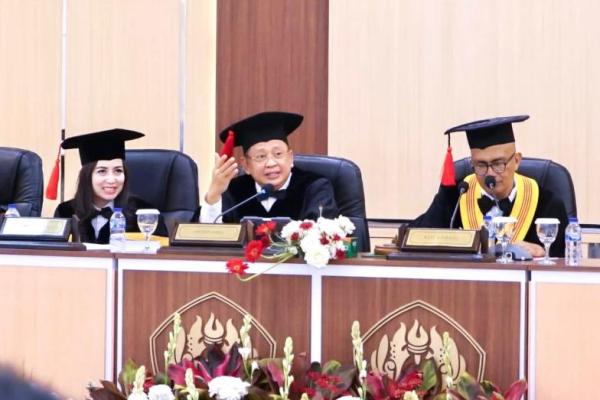 Ketua MPR Bambang Soesatyo atau Bamsoet (tengah) menguji disertasi dalam Ujian Sidang Terbuka Program Doktor Ilmu Hukum Fakultas Hukum UNPAD, Isti Novianti, di Universitas Padjadjaran Bandung, Jumat (6/10/23).