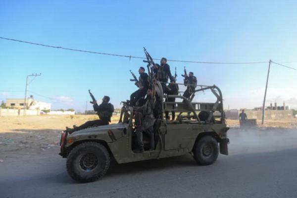 Pejuang Palestina di Jalur Gaza utara mengendarai kendaraan militer Israel yang disita setelah Hamas memasuki wilayah Israel selatan pada 7 Oktober 2023. (FOTO: REUTERS)