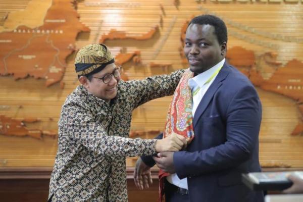 JAKARTA - Menteri Desa, Pembangunan Daerah Tertinggal, dan Transmigrasi (Mendes PDTT) Abdul Halim Iskandar mengenalkan batik, melalui baju dan sarung yang ia pakai serta blangkon yang merupakan bagian dari budaya milik Indonesia, saat audiensi dengan delegasi Pemerintah Republik Rwanda, Afrika Tengah.