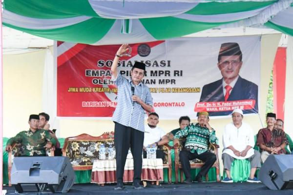 Wakil Ketua MPR Fadel Muhammad dalam acara gelar Sosialisasi Empat Pilar MPR kerjasama MPR dengan Barisan Pemuda Kreatif (BPK) Gorontalo. (Foto: Humas MPR)