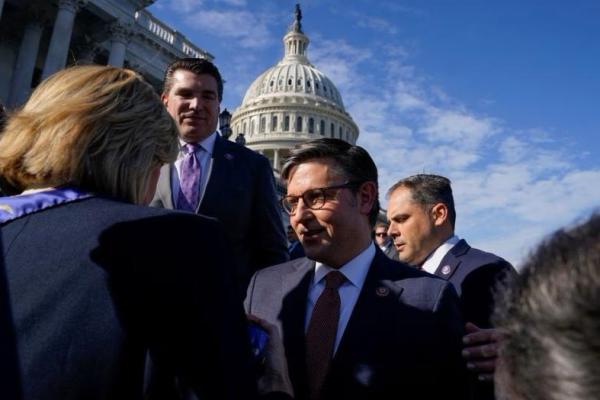 Ketua DPR yang baru terpilih Mike Johnson diberi ucapan selamat oleh anggota Kongres setelah terpilih di US Capitol di Washington, AS, 25 Oktober 2023. Foto: Reuters