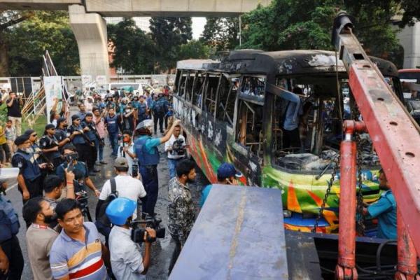 Sebuah bus umum terbakar sebagai protes terhadap tindakan polisi yang menembakkan gas air mata saat bentrokan di Dhaka , Bangladesh, 31 Oktober 2023. Foto: Reuters