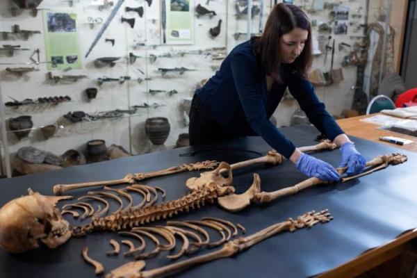 Antropolog dari Universitas Nicolas Copernicus Urszula Okularczyk bersama tulang dari pemakaman abad ke-17 di Universitas Nicolas Copernicus, Polandia, 27 Oktober 2023. Foto: Reuters