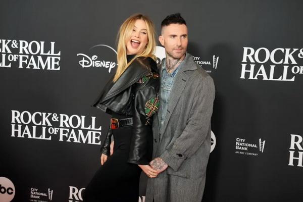 Behati Prinsloo tampak memegang paksa tangan suaminya Adam Levine saat pasangan itu berpose bersama di karpet merah Rock and Roll Hall of Fame Induction Ceremony, Jumat malam (4/11/2023).