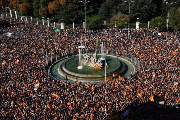 MADRID - Sekitar 170.000 orang melakukan unjuk rasa di Madrid pada hari Sabtu, 18 November 2023. Protes ini merupakan yang terbesar yang menentang undang-undang amnesti yang disetujui oleh kaum Sosialis Spanyol atas upaya separatis Catalonia pada tahun 2017 untuk membentuk pemerintahan.