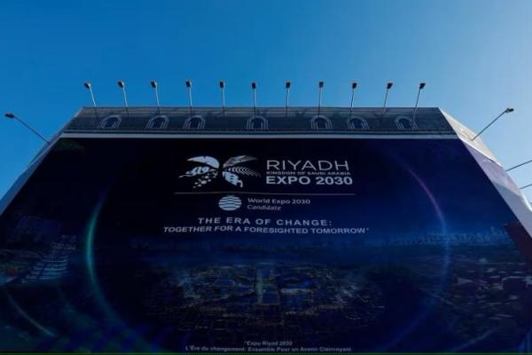 Sebuah papan iklan besar yang mengiklankan Riyadh, Arab Saudi sebagai kandidat World Expo 2030 terlihat di Paris, Prancis, 25 November 2023. Foto: Reuters