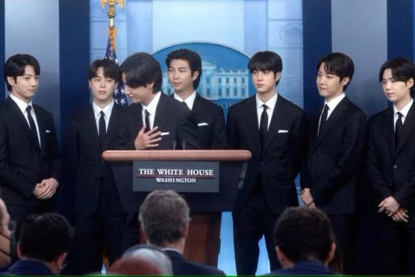 Anggota band K-Pop BTS membuat pernyataan menentang kejahatan rasial anti-Asia di Gedung Putih di Washington, AS, Mei 2023. Foto: Reuters