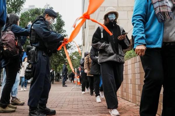 Orang-orang mengantri di luar Pengadilan West Kowloon Magistrates selama persidangan taipan media Jimmy Lai di Hong Kong, Tiongkok 18 Desember 2023. Foto: Reuters